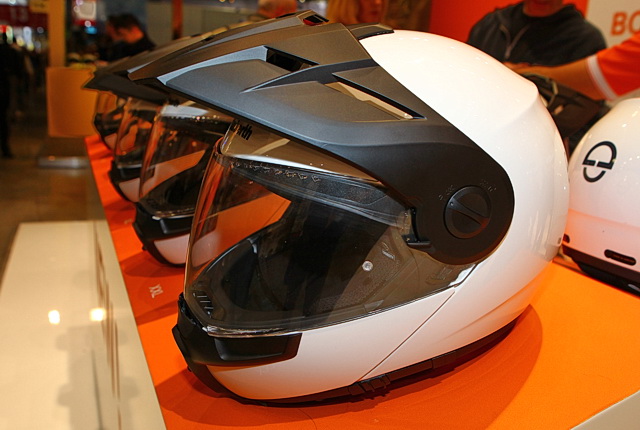 Главной новинкой стал Schuberth E1 - первый серийный шлем типа flip-up (или модуляр) в сегменте премиум, рассчитанный на класс Adventure-туризма с защитным козырьком. Внутренняя отделка, как всегда, безупречна. Основной интерес связан с конструкцией "кепки". Козырек можно зафиксировать в одном из трех положений, и он будет подниматься вверх вместе с забралом! E1 оснащен фирменной системой солнечного визора на тягах и инновационной вентиляцией с тремя разными контурами. Воздухозаборники устроены таким образом, чтобы не пропускать внутрь оболочки пыль и песок. Каждый из трех вентиляционных клапанов регулируется отдельно. Шлем не показался тяжелым или громоздким. Но, определенно, он рассчитан не на спортивную и спорт-туринговую езду, а для длительных путешествий на больших туристических эндуро и ветрозащитой. Schuberth выпускает самую широкую размерную линейку среди конкурентов, в ней 7 размеров от XS до XXXL.