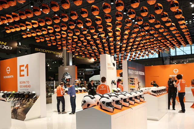Самым посещаемым, наверное, стендом выставки EICMA-2015 стала площадка немецкого производителя премиальных мотошлемов Schuberth. Во-первых, компания произвела заметный ребрендинг: теперь Schuberth весь оранжево-позитивный. Стенд оформили необычным образом, завесив потолок полутора сотнями оранжевых шлемов, что не могло не привлечь внимания издалека!