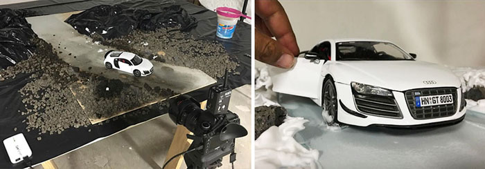 И тут нет никакого мошенничества - фотография реальна, применение Photoshop - минимальны. Ну и что с того, что автомобиль много раз меньше оригинального - саму компанию Audi это не смущает, они сами наняли Феликса (Felix Hernandez Rodriguez), зная о его великолепном опыте работы с миниатюрами. Одно дело гонять спортивный автомобиль Audi R8 по грязи, воде и прочим "неприятностям" ради картинки, и другое - сделать из процесса съемок целое шоу. Хуже от этого автомобиль не стал, а рекламные картинки получились диво как хороши.
